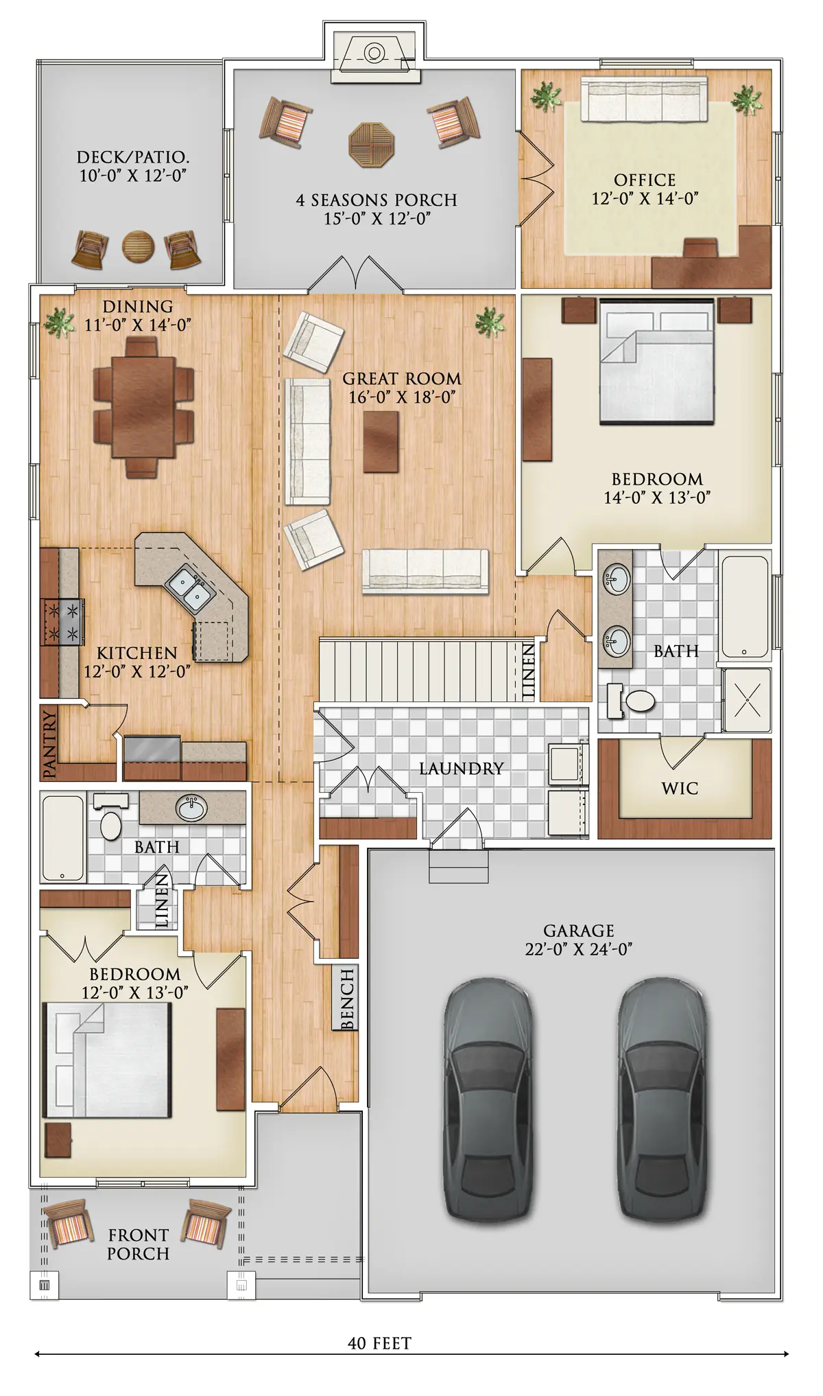 The main difference between the floor plans is the Birchmere and the Wilshire both have an office option that could also be converted into a third bedroom with the addition of a closet. These plans are especially favored on our crawl space lots as you do not have a basement so this extra room is greatly appreciated! If you are looking for a wider interior floor plan you will want to select either the Mapleton or the Wilshire plan as they are two feet wider on the interior.