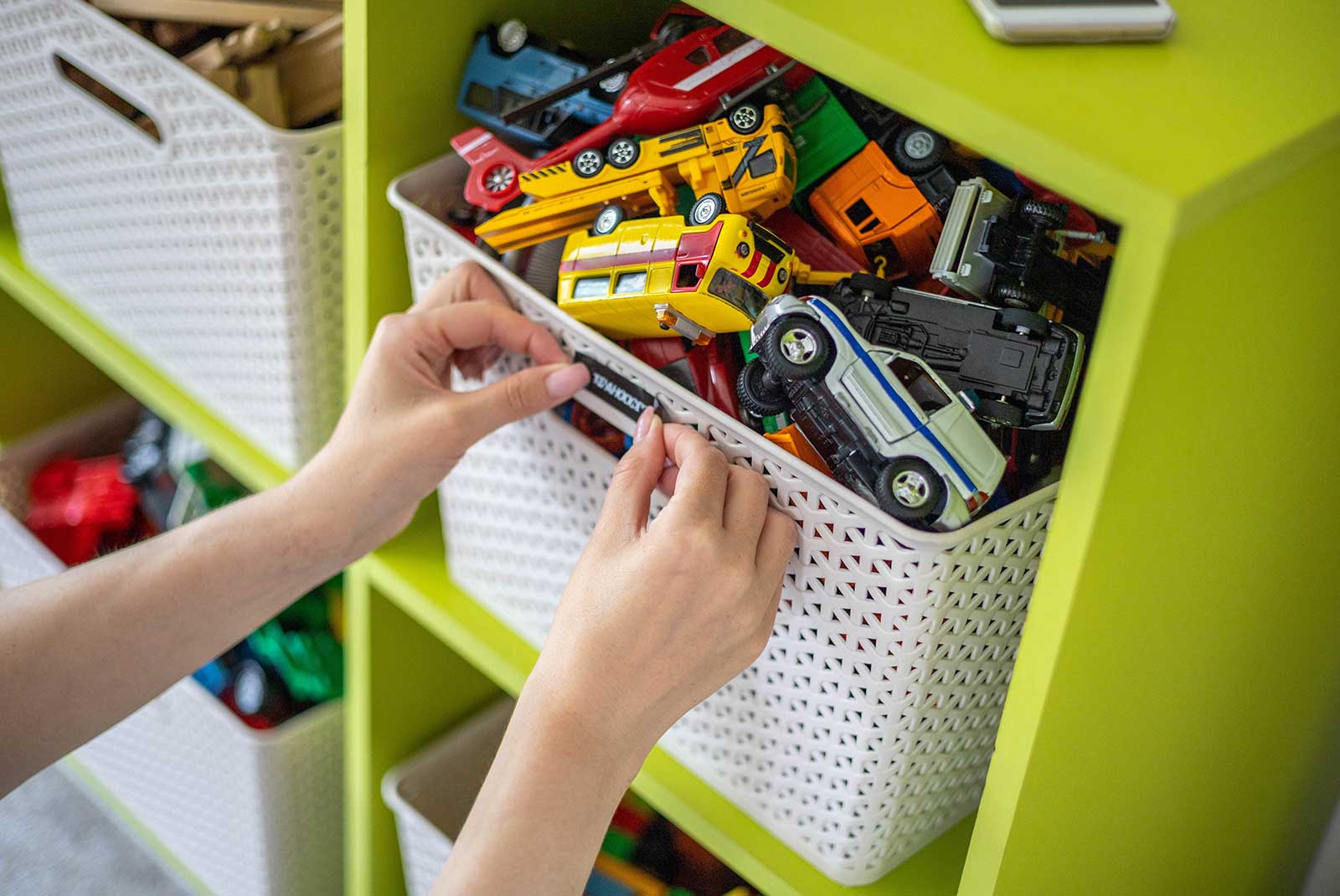 • Organize must-have toys in bins and shelves.