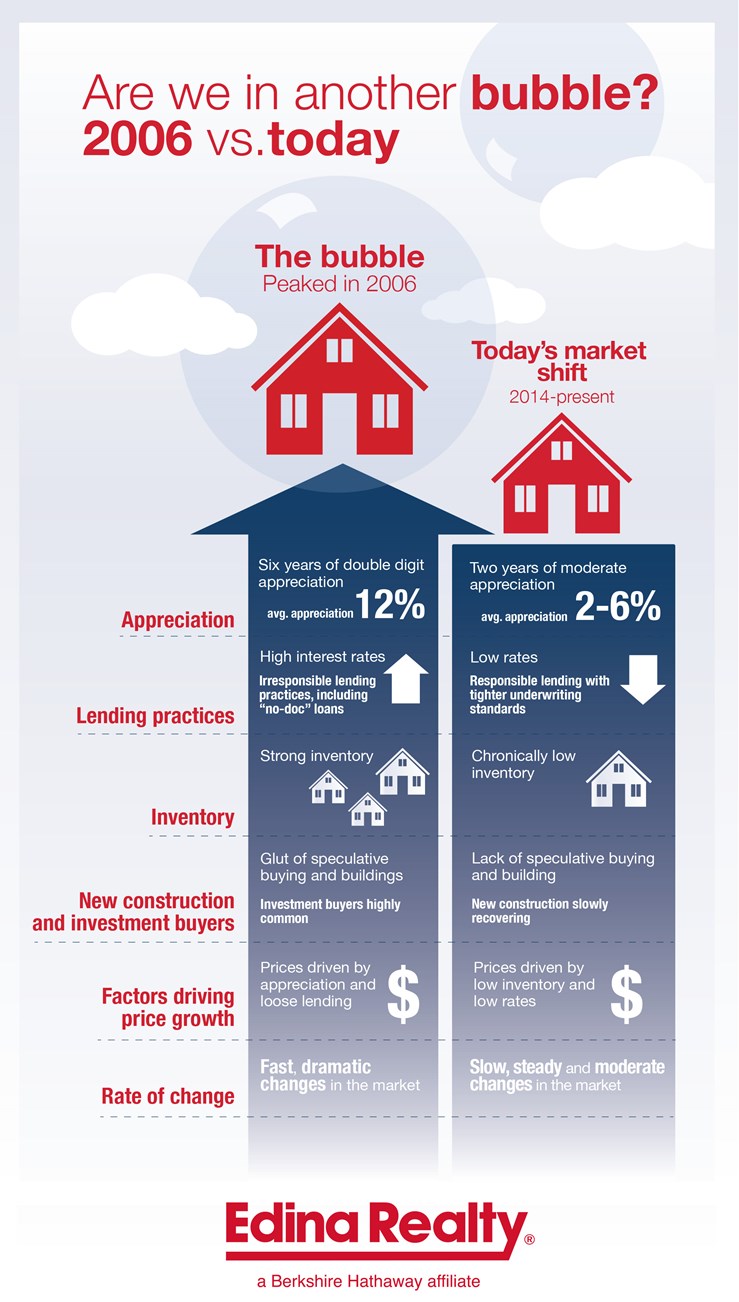 As our local market continues to improve, buyers, sellers and homeowners are wary that prices may be rising too much. To determine if we’re in a bubble today, we analyzed current market stats against some of the conditions related to the housing bubble that peaked in 2006. Let’s explore what they mean.