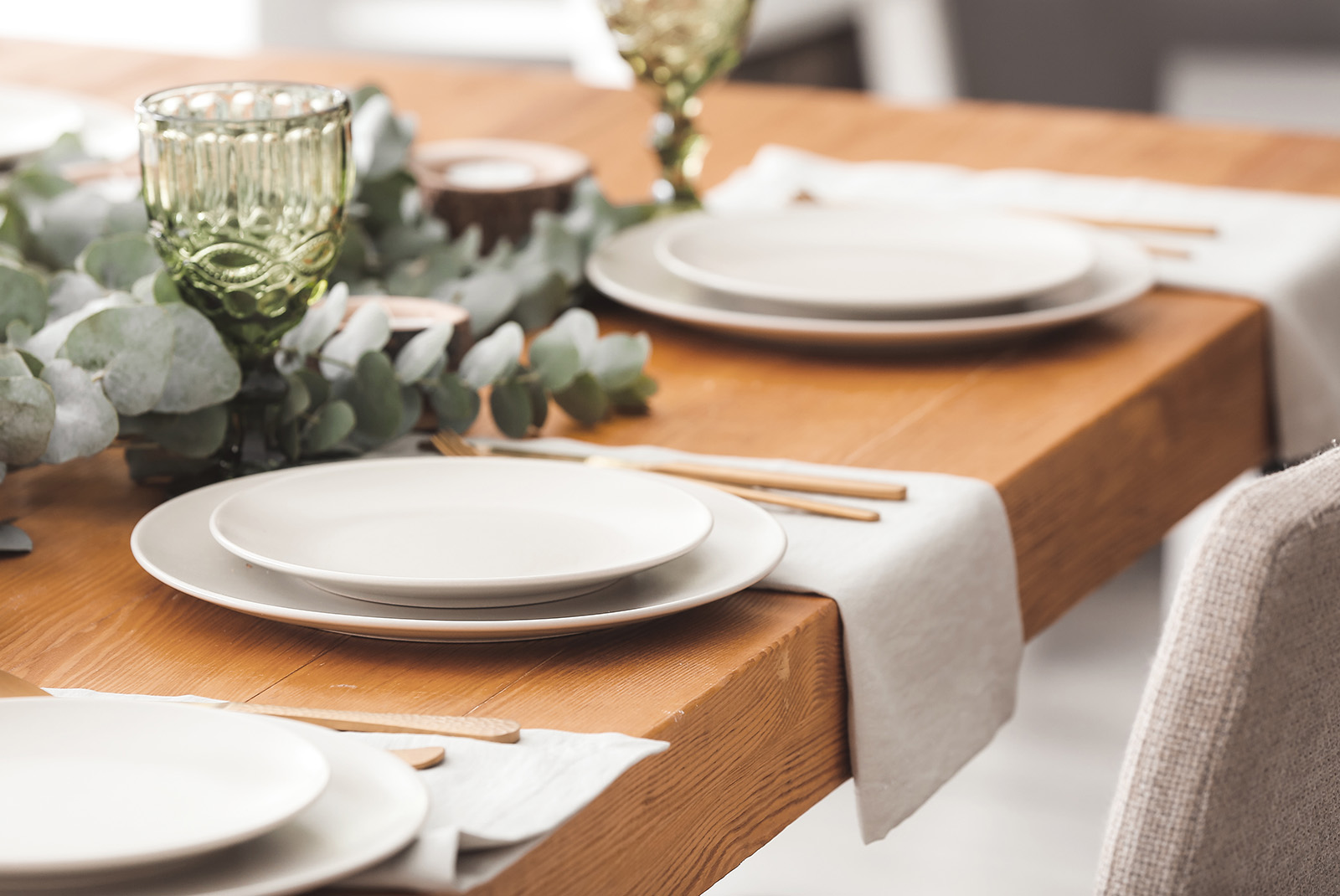 - Table settings: Simplify your centerpieces so the table has plenty of room for food and place settings, and keep centerpieces low so everyone can see and talk to each other during the meal. You can also nix the centerpieces altogether and make each table setting shine with an elegant layout, folded napkins or place cards. Your guests will be wowed and feel special by the personalized attention.